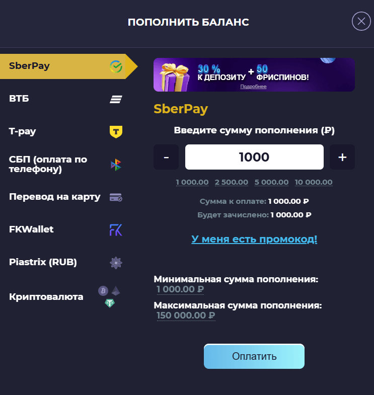 | 💳 Методы депозита | Криптовалюта, банковские карты, СберПэй, СБП, FKWallet, Skins Pay, Piastrix |